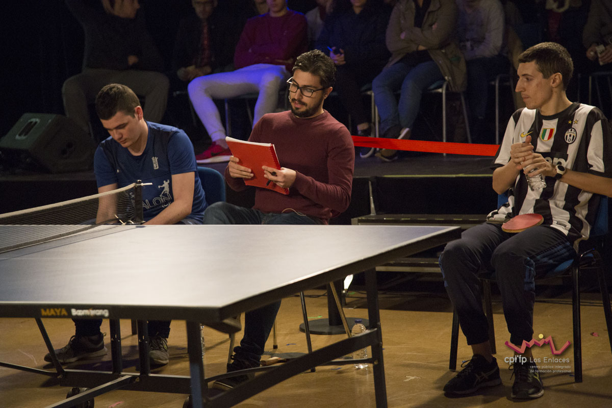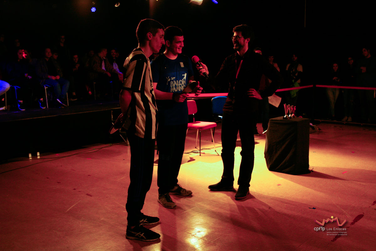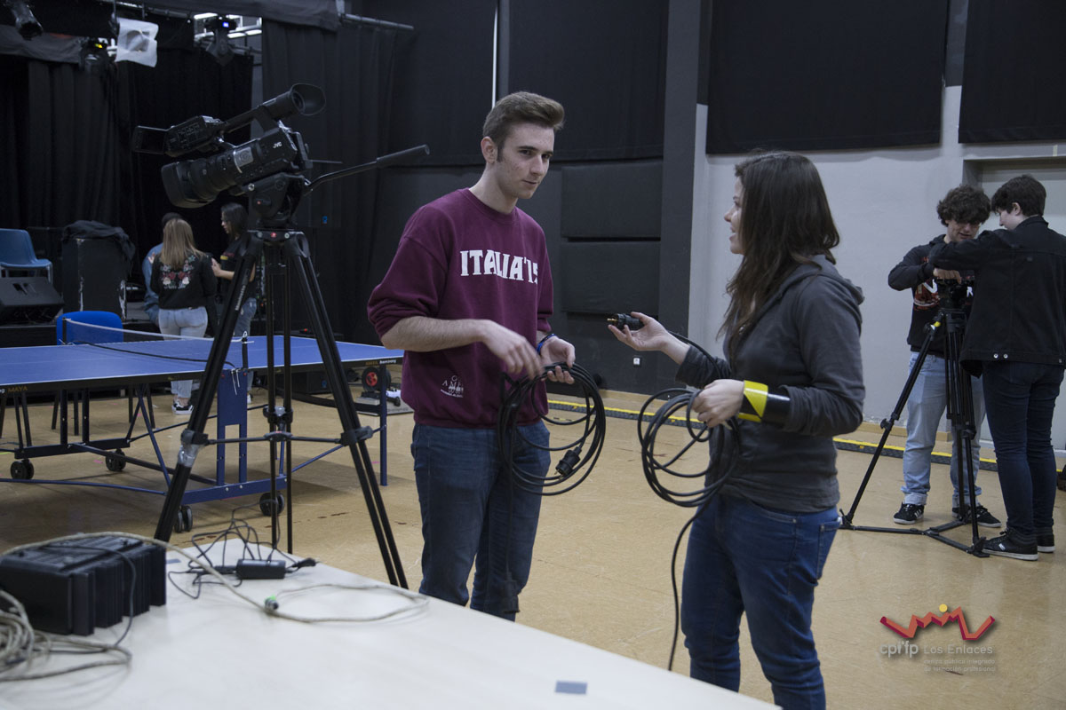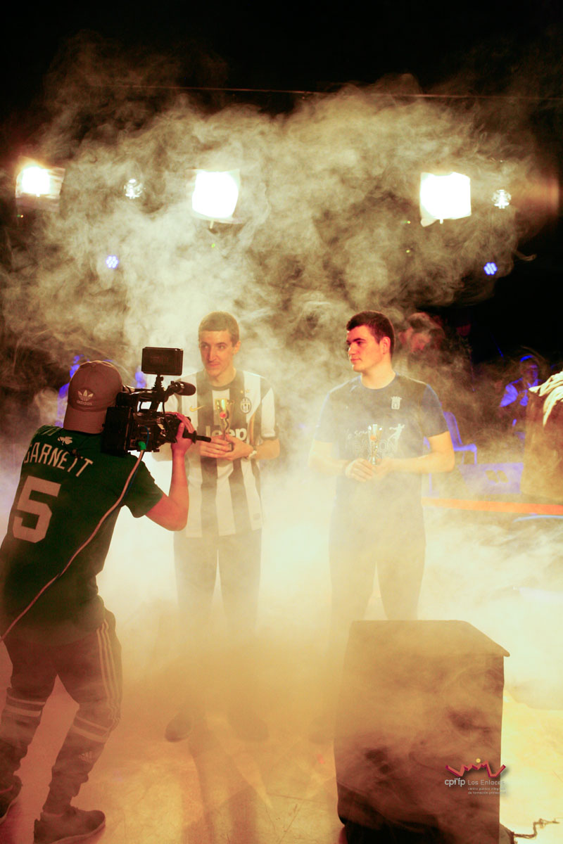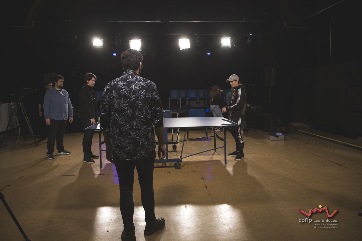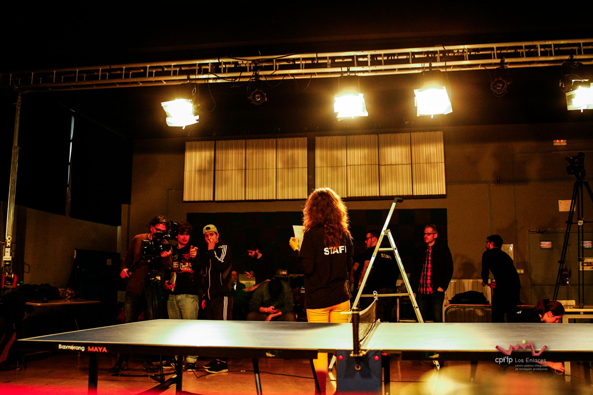 En esta ocasión hemos contado con alumnos de los ciclos de 1º de Realización, 1º de Iluminación, 1º y 2º de Video-DJ, así como con algunos de sus profesores que a lo largo de la mañana del día 14 de marzo, en apenas tres horas, han conseguido montar las luces, las cámaras, la microfonía y todo lo necesario para realizar una realización multicámara de la final, la cual se jugó durante el recreo con comentaristas, público, árbitro, efectos de luces, retransmisión en directo por streaming y, por supuesto, los finalistas.